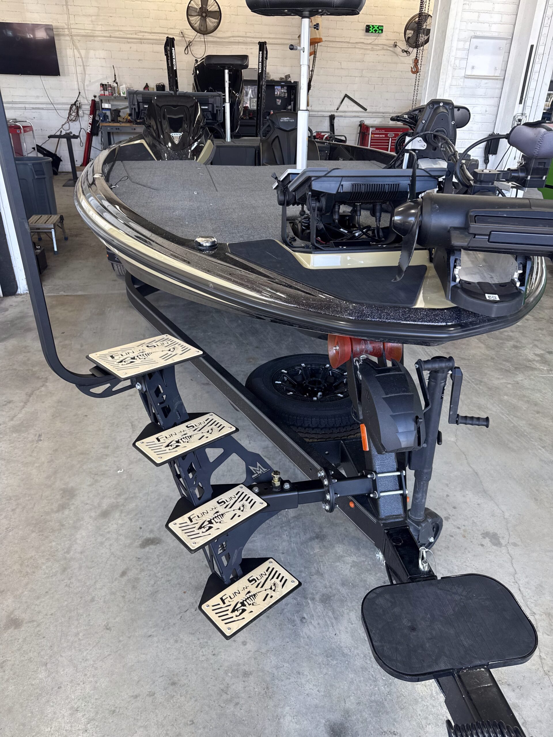 Our Bass Boat Steps are fully custom to match the color of your rig as well as sport your logos, or sponsors. All parts to the system are completely universal except for the winch post bracket.