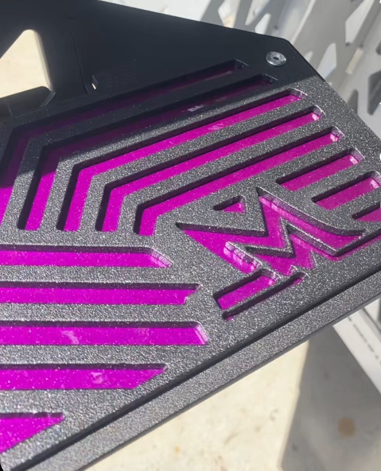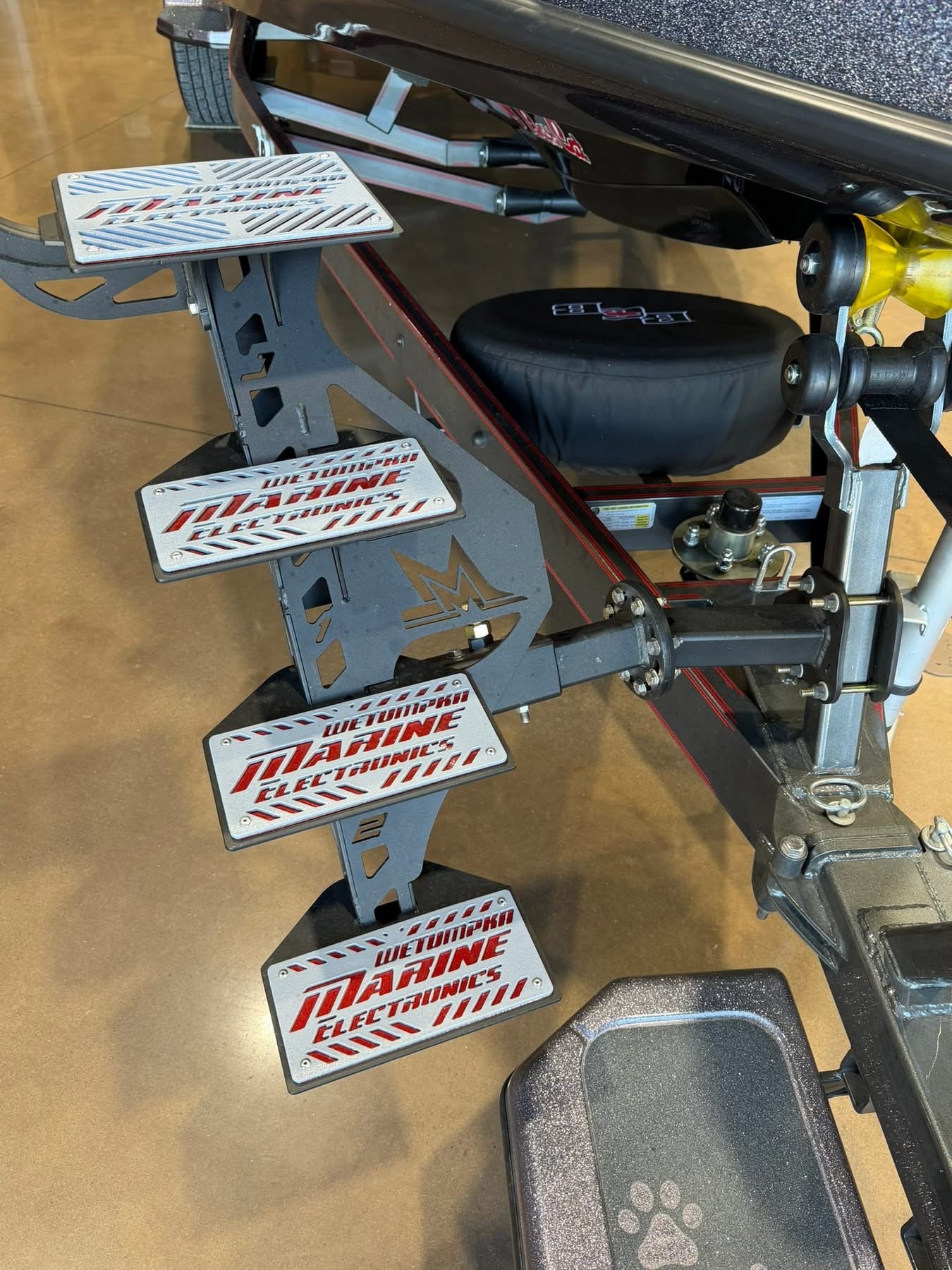 Our Bass Boat Steps are fully custom to match the color of your rig as well as sport your logos, or sponsors. All parts to the system are completely universal except for the winch post bracket. We will most likely have the bracket in our database when you tell us what boat you have but if not we can get one designed and made up no problem with a few simple measurements to give your boat the perfect fit. Our frames are made of 1/8″ steel and come in a textured matte black unless requested otherwise. The treds are the colored plates riveted to the frame that have your logo cut into them. We use a heavy duty course coating powdercoat that comes in over 20 different color options. If you want your logo to be another color other than the color of your step frame (black or silver) then you have the add on option to do filigree plates which is a colored backup plate we lay in behind the treads to change logo cut out to your desired color.  All brackets and piping are made of 1/4″ as well as 3/16″ Square tubing.  There will be a 50.00 dollar design fee for any logos we do not have in our database to be cut into your treads.
