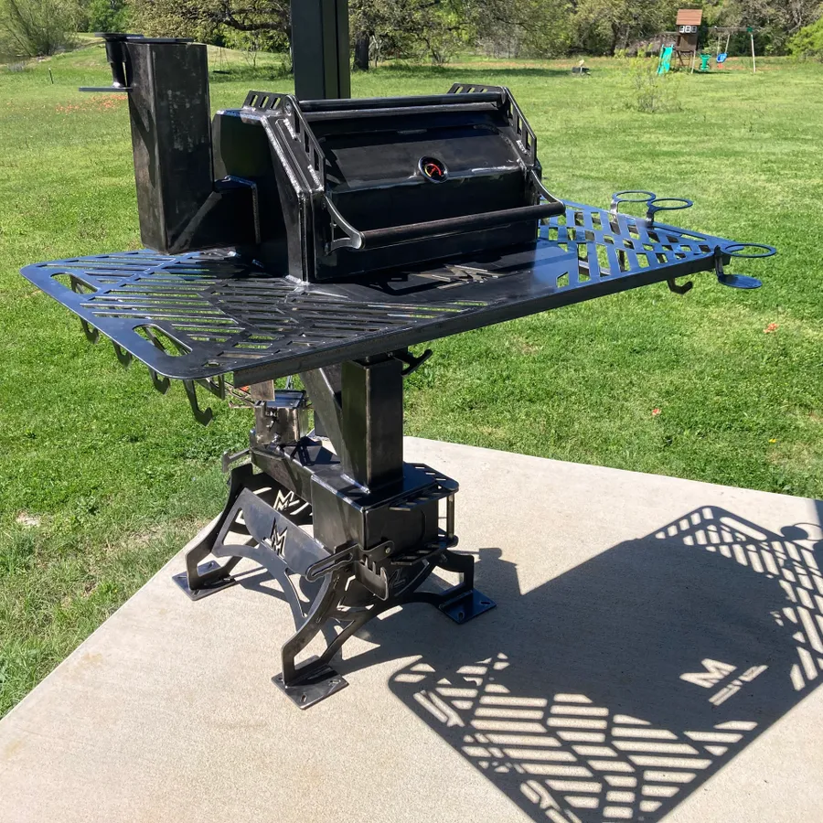 This Deluxe Rocket Stove is ALL THERE! With a detachable grill top with two people, you can easily swap to a Dutch oven top for something simpler! Run this bad boy off of charcoal in the small firebox or you can use some small wood, dial her down and cook low and slow. The cooking chamber is all 1/4″ steel, increase your mobile cooking game and taste the savory smoke flavor cooking on this american made grill! enjoy the large cooking table with seasoning holders along with cup holders and plenty of room for plates and cutting boards! Caster wheels $100